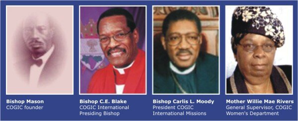 Azuza Street Revival of 1906 is one of the mighty revivals in the history of Christendom which shook Nations with the Power of the Holy Ghost. Church of God In Christ (COGIC) is the Major Church emerged out of this Great Revival. COGIC was organized in 1907 by Bishop Charles Harrison Mason. COGIC celebrated its Centennial Celebraton in 2007. Church of God in Christ is spread in 61 countries around the world and have more than 7 million members. This is a Pentecostal Holiness Chuch. Bishop Charles EdwardBlake serves as the Presiding Bishop of this organization, Bishop Philip A. Brooks as the First Assistant Presiding Bishop and Bishop Jerry W. Macklin as the Second Assistant Presiding Bishop. Mother Willie Mae Rivers is the International Women Supervisor and Bishop Carlis L. Moody is the President of International Missions. Bishop Dr. Bevin G. Lawrence serves as the Jurisdictional Prelate of the Church of God in Christ India III Jurisdiction